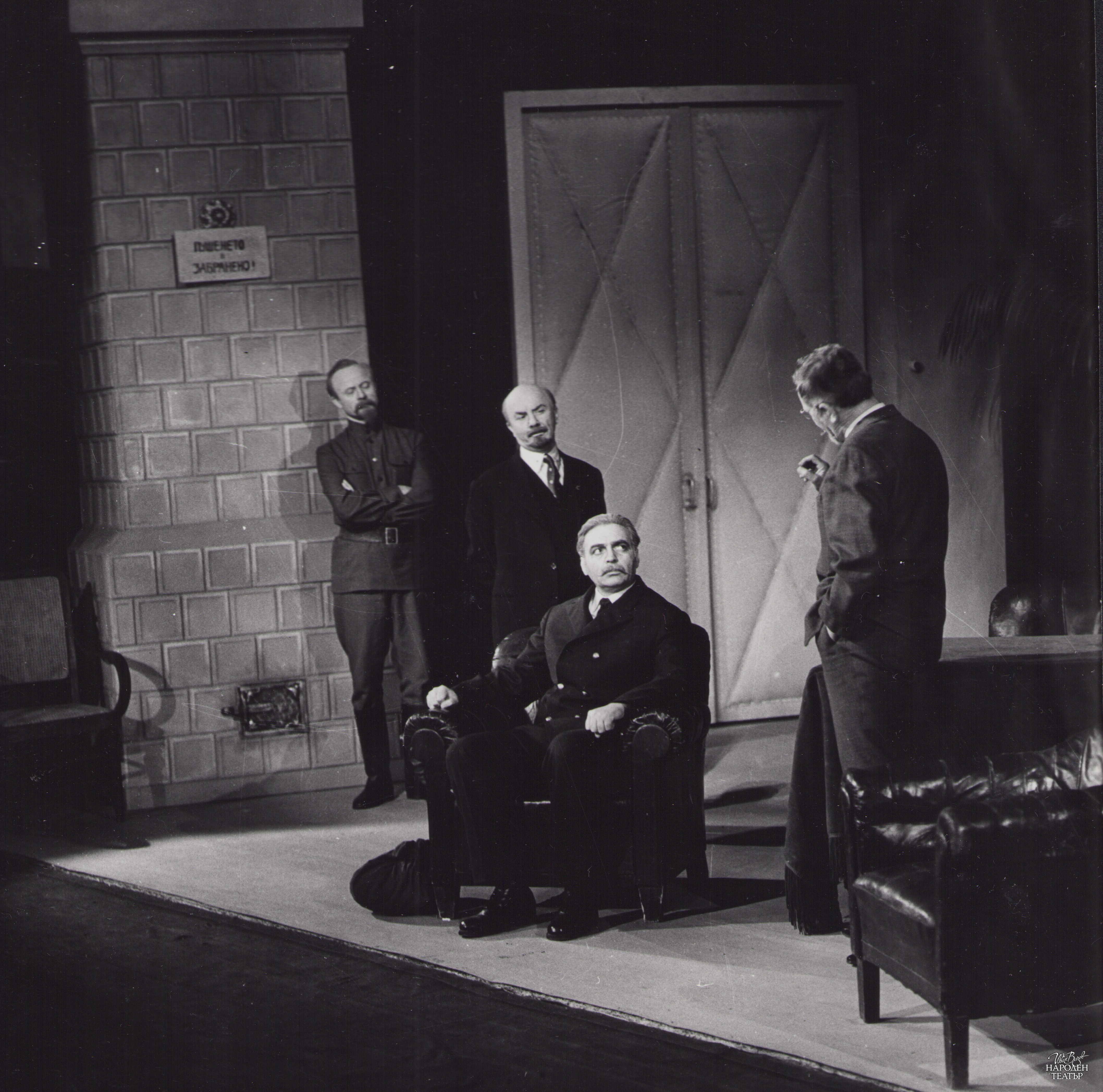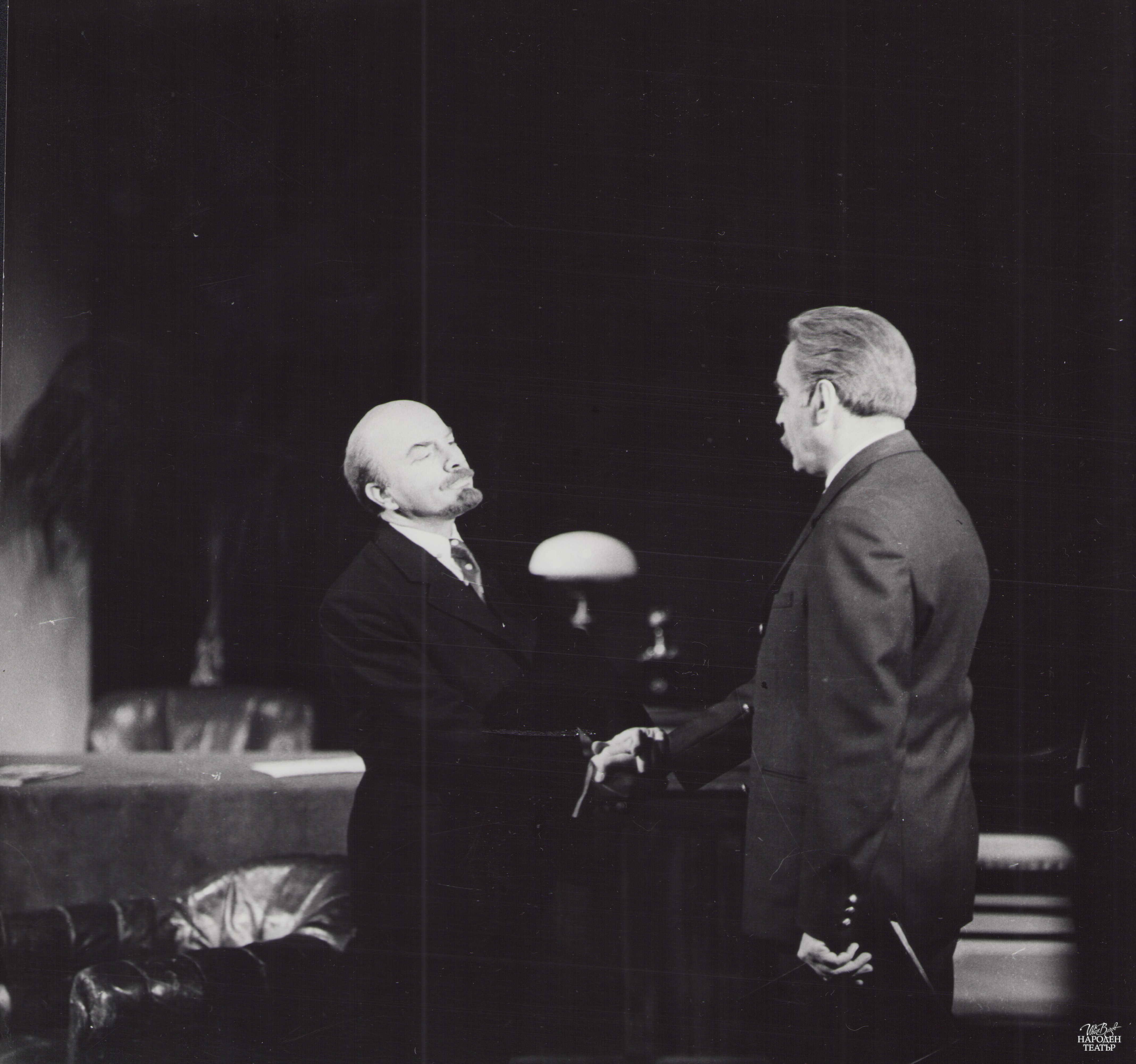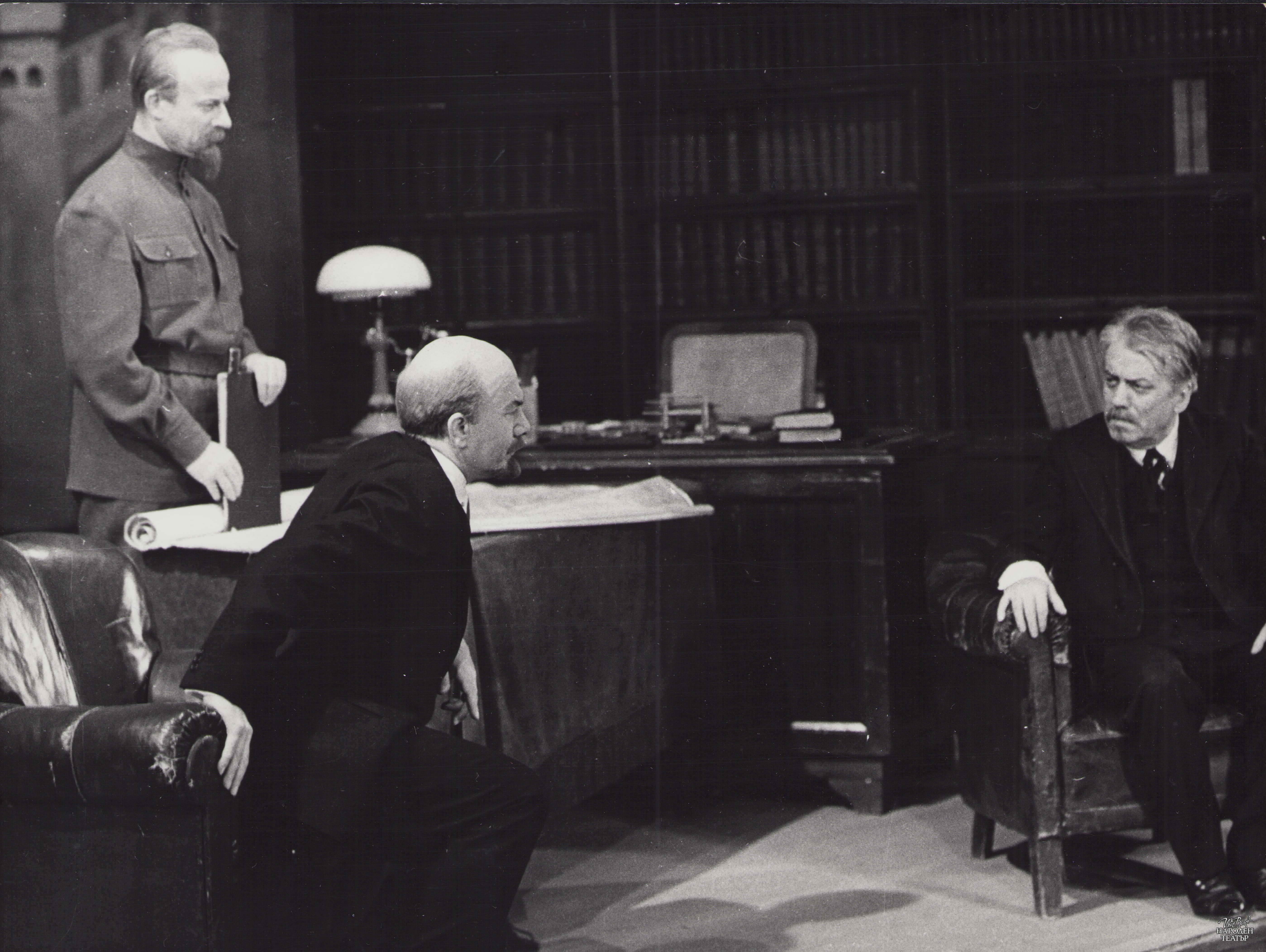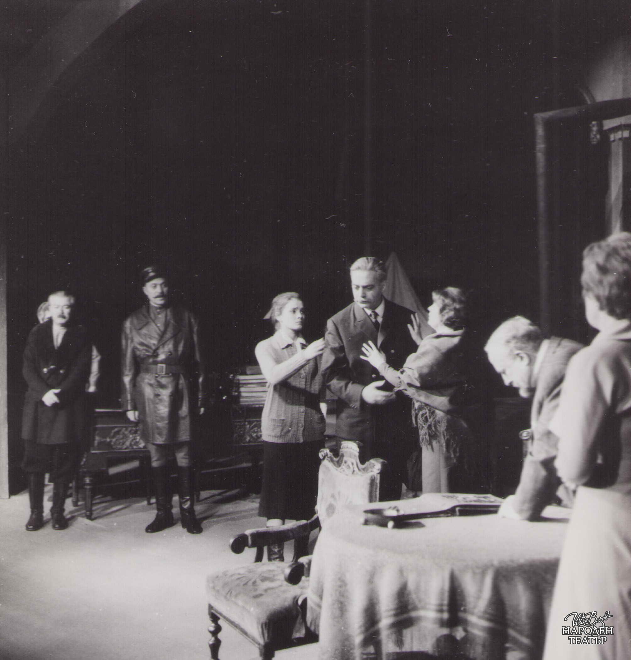 | Актьорски състав: | Ленин - Рачко Ябанджиев; Дзерджински - Емил Стефанов; Рибаков - Георги Гайтаников; Забелин - Любомир Кабакчиев; Забелина - Лили Попиванова; Маша - Виолета Гиндева; Старшият работник - Стефан Великов; Брадатият работник - Никола Динев; Младият работник - Николай Николаев, Емил Капудалиев; Старицата-просекиня - Магда Колчакова, Олга Кирчева; Дамата с плетивото - Таня Масалитинова; Изплашената дама - Славка Славова; Скептик - Стефан Димитров; Оптимист - Стефан Сърбов; Готвачката на Забелини - Виолета Декало; Председател на Домкома - Борис Сарафов; Военен - Соломон Аладжем; Секретар на Ленин - Динко Динев; Глаголев - Любен Желязков; Часовникар - Лео Конфорти, Иван Кондов; Английски писател - Николай Узунов; Търговка на кукли - Кунка Баева; Червеноармеец - Васил Стойчев; Минувач - Евтим Вълков; Духовно лице - Пламен Чаров; Спекулант - Иван М. Попов; Търговка на сланина - Стефка Берова; Жена - Мария Брайкова; Търговка - Стефка Кацарска; Човек с ботуши - Стефан Стайчев; Продавачка на захарин - Милка Стубленска; Продавачка на пояси - Радка Ялъмова; Безпризорни, минувачи, продавачи, курсанти - студенти от ВИТИЗ |